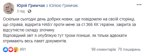 "Оскільки сьогодні день хороших новин, ще повідомлю на своїй сторінці, що провадження, зареєстроване НАБУ проти мене за статтею 366 Кримінального кодексу України, закрите за відсутністю складу злочину", – зазначив Гримчак.