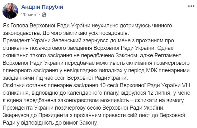 Президент України Зеленський звернувся до мене з проханням про скликання позачергового засідання Верховної Ради України. Однак скликання такого засідання не передбачено Законом, адже Регламент Верховної Ради України передбачає можливість скликання позачергового пленарного засідання у невідкладних випадках у період МІЖ пленарними засіданнями під час сесії Верховної Ради України.
