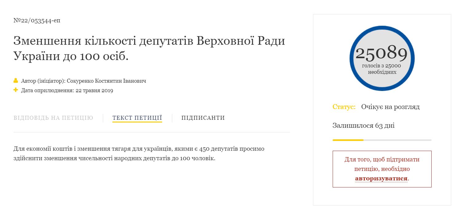 Електронна петиція до президента Володимира Зеленському про скорочення кількості депутатів Верховної Ради до 100 набрала необхідні для розгляду 25 000 голосів, свідчать дані на сайті президента.