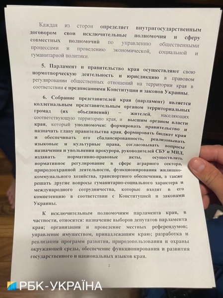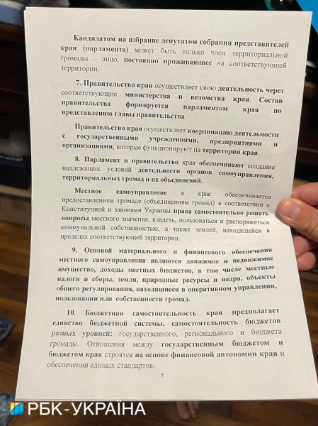 За даними джерела, документ передбачає перейменування цих областей у так звані "краї", широку автономію, проведення виборів, формування окремого уряду та парламенту.