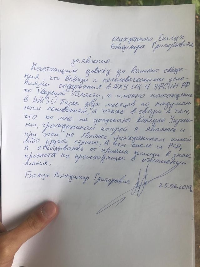 Балух написав листа, де підтверджує, що починає голодування. Напередодні Балух повідомив, що в колонії є загроза його життю.