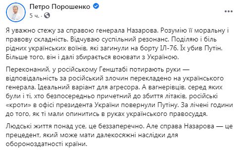 "Я уважно стежу за справою генерала Назарова. Розумію його моральну і правову складність. Відчуваю суспільний резонанс. Поділяю біль рідних українських воїнів, які загинули на борту ІЛ-76. Їх убив Путін. Більш того, він і далі збирається воювати з Україною", – підкреслив Порошенко.