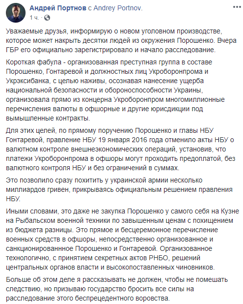 За словами Портнова, Порошенко, Гонтарєва і посадові особи Укроборонпрому і Укрексібанка організували прямо з концерну Укроборонпром багатомільйонні перерахування валюти в офшорні і інші юрисдикції під вигадані контракти.