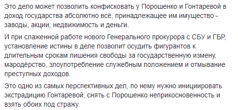 "Ця справа може дозволити конфіскувати у Порошенка і Гонтарєвої в дохід держави абсолютно все майно, що їм належить - заводи, акції, нерухомість і гроші. І при злагодженій роботі нового генерального прокурора з СБУ і ДБР, встановлення істини в справі дозволить засудити фігурантів до тривалих термінів позбавлення волі за державну зраду, мародерство, зловживання службовим становищем та відмивання злочинних доходів", - написав Портнов.