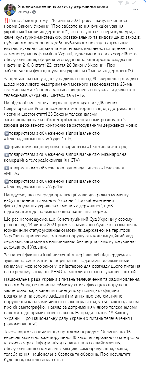 Національна рада України з питань телебачення та радіомовлення не повинна обмежуватися фіксацією порушень законодавства, а зайняти принципову позицію, офіційно розглянути на своєму засіданні питання про систематичне порушення каналами чинного законодавства, наголосив мовний омбудсмен. Також він зазначив, що з 16 липня по 16 вересня порушено 30 заходів державного контролю у таких сферах: інформація для загального ознайомлення, обслуговування споживачів, місцеве самоврядування, освіта, телебачення, національна безпека та оборона.