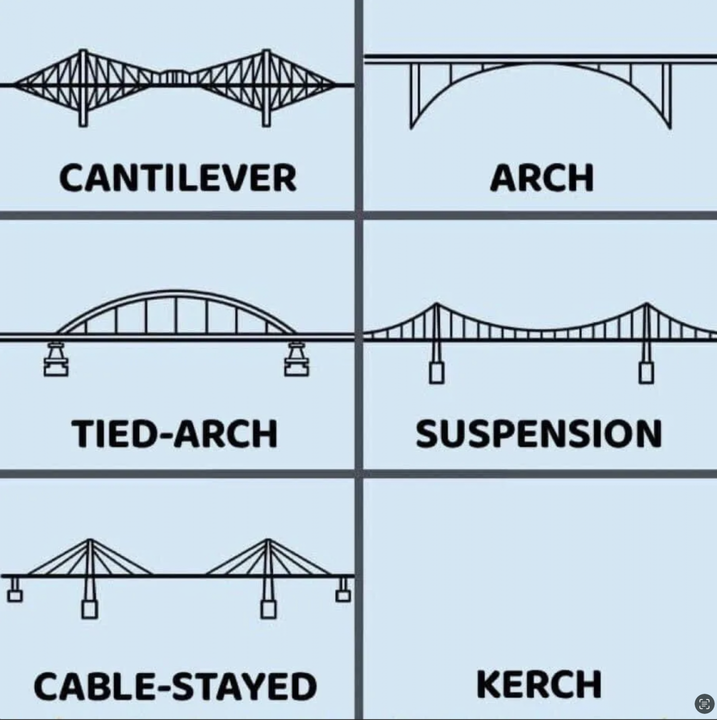 Зокрема, у списку названо "Аркові мости", "Консольні мости", "Вантові мости", "Підвісні мости", "Пов'язані аркові мости" та "Керченські мости". У перших п'яти випадках представлені схематичні ілюстрації мостів, але над підписом "Керченські мости" – просто порожнє місце.