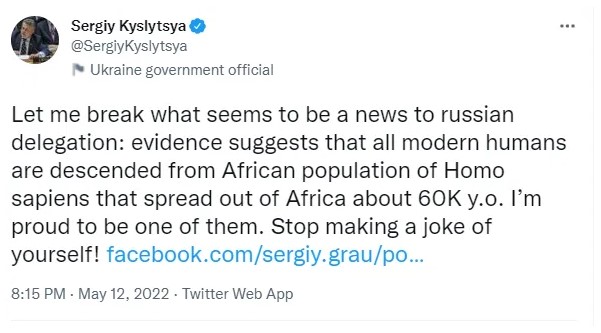 "Дозвольте мені повідомити те, що здається новиною для російської делегації: дані свідчать про те, що всі сучасні люди походять від африканської популяції Homo sapiens, яка поширилася з Африки близько 60 тисяч років тому", – іронічно відреагував Кислиця на черговий абсурд, влаштований РФ в ООН.