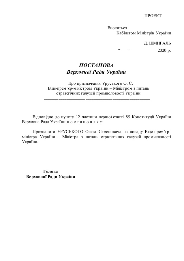 Прем'єр-міністр України Денис Шмигаль вдруге вніс до Верховної Ради проєкт постанови про призначення віцепрем'єр-міністра з ОПК. Призначити знову очільник уряду пропонує Олега Уруського. Про це йдеться на сайті Ради. Відповідний проєкт постанови №3842 у Раді зареєстрували у вівторок, 14 липня. "Призначити Уруського Олега Семеновича на посаду віце-прем’єр-міністра України - міністра з питань стратегічних галузей промисловості України", - йдеться у документі.