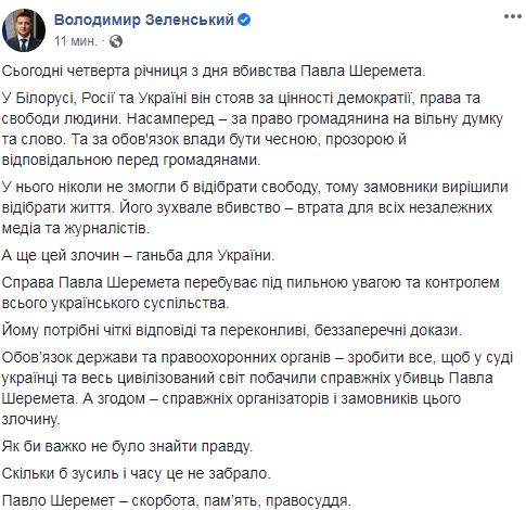 Президент Зеленський зробив заяву, що стосується загибелі журналіста Павла Шеремета