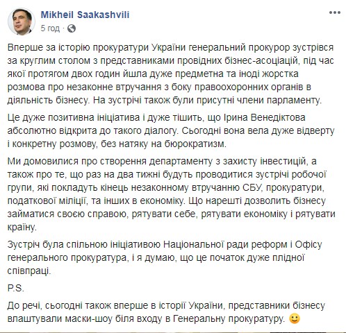"Вперше за історію прокуратури України генеральний прокурор зустрівся за круглим столом із представниками провідних бізнес-асоціацій, під час якого протягом двох годин йшла дуже предметна та іноді жорстка розмова про незаконне втручання з боку правоохоронних органів у діяльність бізнесу. На зустрічі також були члени парламенту", - написав Саакашвілі у Facebook у четвер, 21 травня.