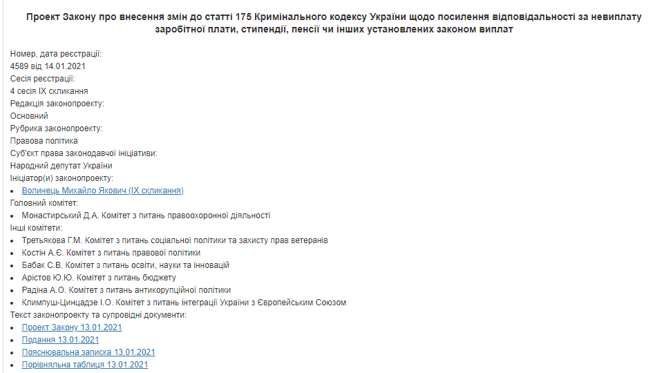 У Верховній Раді зареєстрували законопроєкт №4589, який має посилити відповідальність керівників за невиплату заробітної плати, стипендій та пенсій. Пропонується утричі збільшити розмір штрафів за порушення. Ініціатор законопроєкту – Михайло Волинець від фракції "Батьківщина".