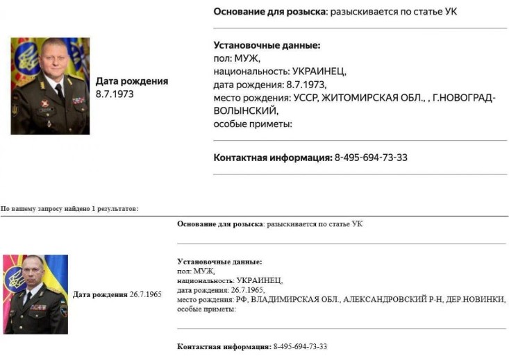 Дані про це з'явилися у базі розшуку МВС РФ. У графі "Підстава для розшуку" зазначається, що Залужного та Сирського нібито розшукують за статтею Кримінального кодексу РФ.