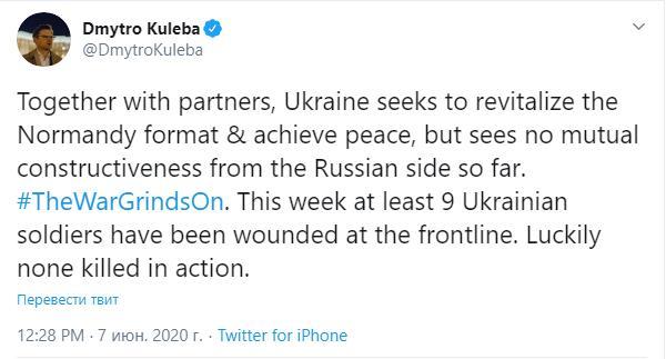 "Разом з партнерами Україна прагне оживити нормандський формат і досягти миру, але поки не бачить ніякої взаємної конструктивності з російського боку", - написав Кулеба. Також він зазначив, що в зоні проведення операції Об'єднаних сил протягом минулого тижня були поранені 9 українських захисників. "На цьому тижні не менше 9 українських солдатів були поранені на лінії фронту. На щастя, ніхто не загинув у бою", - підкреслив глава МЗС України.