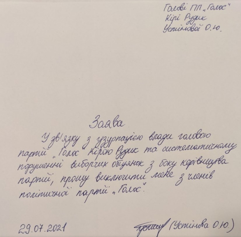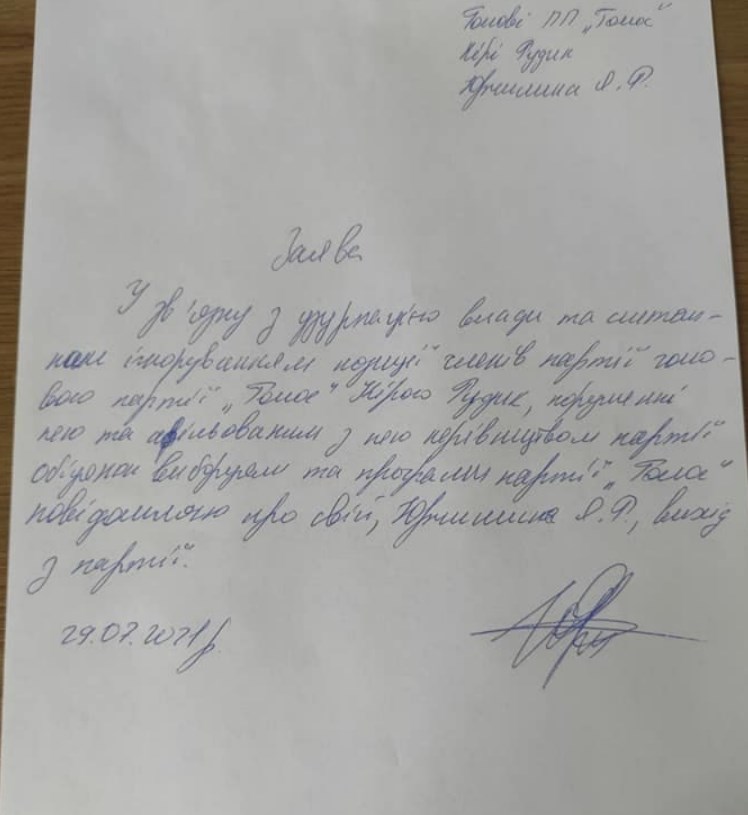 Половина членів фракції "Голос" у парламенті (десять народних депутатів) висловила недовіру Ярославу Железняку, її керівнику. Вони оголосили наміри створити окреме об'єднання в парламенті під назвою "Справедливість".