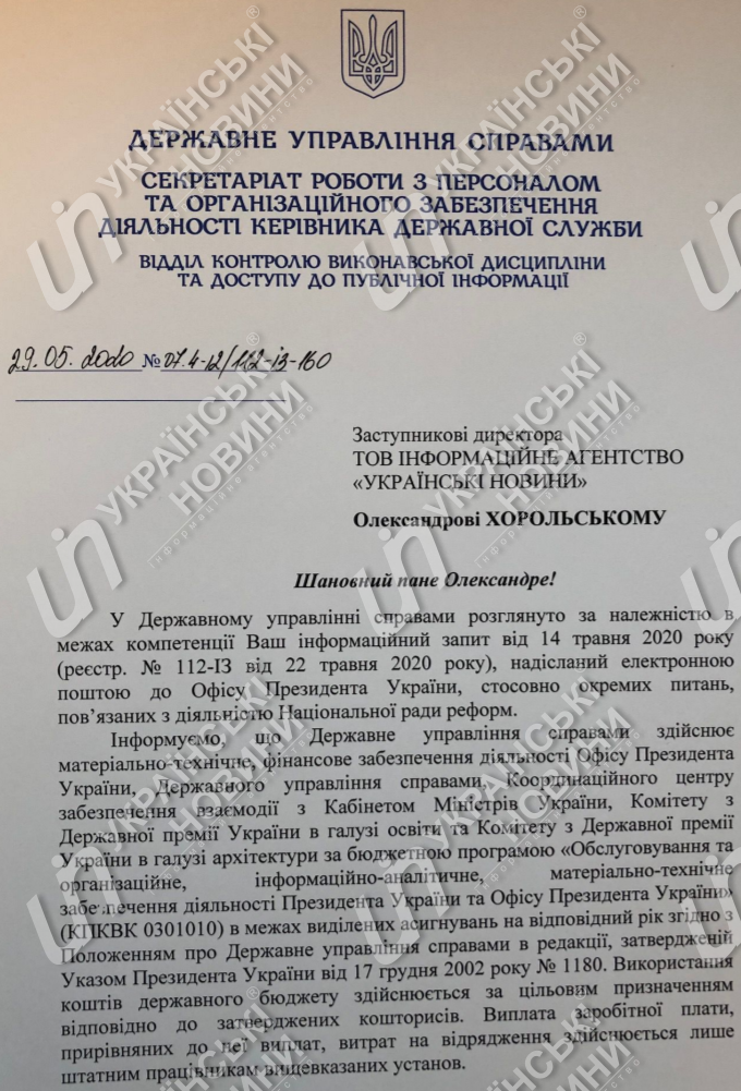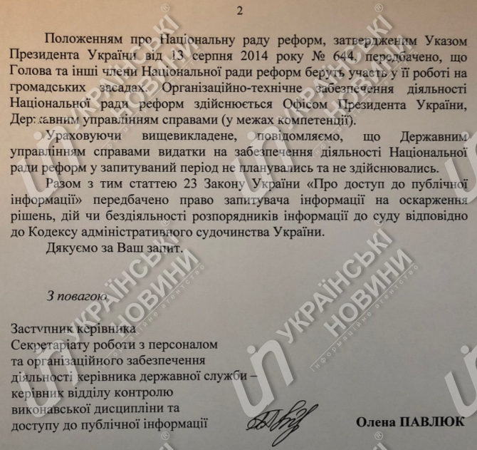 Офіс Президента України та Державне управління справами здійснюють організаційно-технічне забезпечення даного відомства. У документі вказано, що видатки на забезпечення діяльності Національної ради реформ «не планувались і не здійснювались».