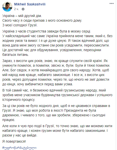Колишній президент Грузії та голова виконавчого комітету Національної ради реформ України Міхеїл Саакашвілі заявив, що повертається на батьківщину. Саакашвілі написав емоційний пост у Facebook, у якому розповів про свої тривалі "стосунки" із Україною і назвав країну своїм другим домом.