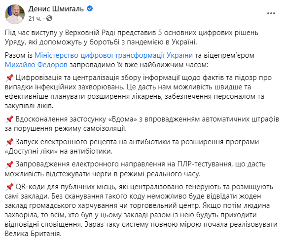 Прем'єр-міністр України Денис Шмигаль під час виступу у Верховній Раді представив п'ять основних цифрових рішень Кабміну, які мають допомогти у боротьбі з пандемією коронавіруса. За словами очільника уряду, разом із Міністерство цифрової трансформації України рішення будуть запроваджені вже найближчим часом.