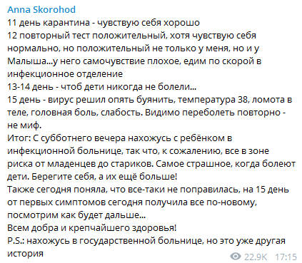 "Мабуть, перехворіти повторно — не міф", - розповіла Ганна. Також вона повідомила, що з 4 квітня з дитиною перебуває в державній лікарні. За її словами, через 15 днів вона себе одужує не відчуває.