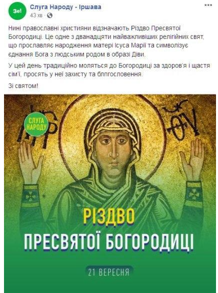 На Закарпатті місцевий осередок партії "Слуга народу" привітав українців з Різдвом Пресвятої Богородиці, наклавши політичний логотип на ікону. Ікону також частково зробили зеленою. Пост із привітанням був опублікований у Facebook-сторінці партійного осередка. "Зараз православні християни відзначають Різдво Пресвятої Богородиці. Це одне з дванадцяти найбільш важливих релігійних свят, яке прославляє народження матері Ісуса Марії і символізує єдність Бога з людським родом в образі Діви. У цей день традиційно моляться до Богородиці за здоров'я і щастя сім'ї, а також просять у неї захисту і благословення", - йшлося у повідомленні. Після того, як таке привітання викликало скандал, пост видалили зі сторінки в Facebook.
