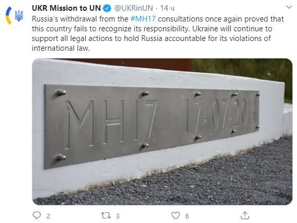 Україна продовжуватиме підтримувати юридичні дії щодо притягнення Російської Федерації до відповідальності за збиття літака рейсу МН17 у небі над Донбасом. Про це повідомляє Постійне представництво України при ООН у Twitter. У повідомлення йдеться, що відмова Росії від консультацій щодо MH17 ще раз довела, що ця країна не визнає своєї відповідальності. Натомість Україна продовжуватиме підтримувати всі юридичні дії щодо притягнення Росії до відповідальності за порушення міжнародного права.