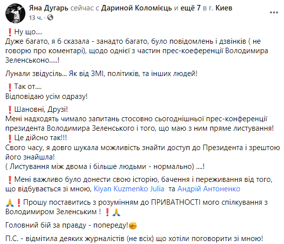 Яна Дугарь написала на своїй сторінці у соцмережі, що до неї надходять чимало запитань стосовно пресконференції президента Володимира Зеленського і того, що вона має з ним пряме листування. Дугарь повідомила, що свого часу вона тривалий час шукала можливість знайти доступ до президента і зрештою його знайшла "Мені важливо було донести свою історію, бачення і переживання від того, що відбувається зі мною, Юлією Кузьменко та Андрієм Антоненком", - пояснила Дугарь.