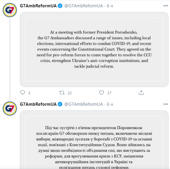 Посли країн "Великої сімки" провели зустріч із п'ятим президентом України, лідером партії "Європейська Солідарність" Петром Порошенком. Під час зустрічі йшлося про результати місцевих виборів, міжнародні зусилля у боротьбі з COVID-19 та кризову ситуацію, пов'язану з Конституційним Судом. Про це йдеться у Twitter американського головування у Групі послів G7. Під час зустрічі сторони зійшлись на думці щодо необхідності об'єднання сил, що виступають за реформи, для врегулювання кризи з КСУ, зміцнення антикорупційних інституцій в Україні та розв'язання питань судової реформи.