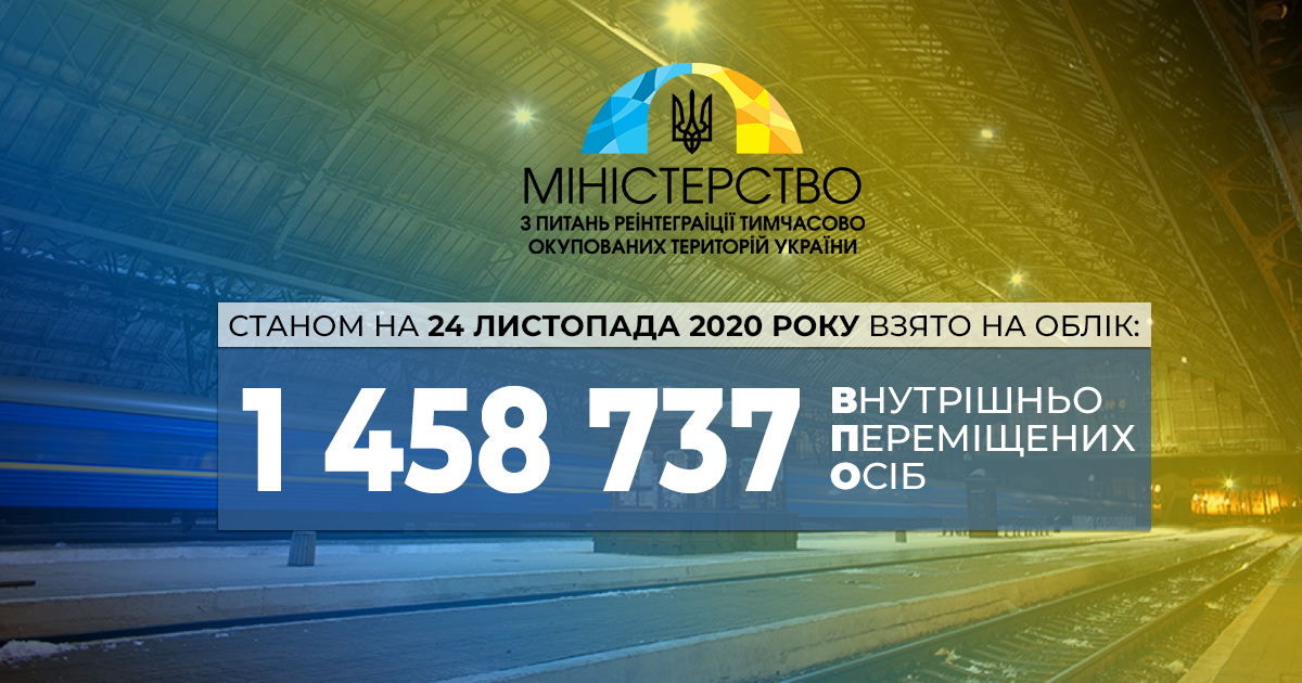 В Україні за даними на 24 листопада зареєстровано понад 1,4 мільйона внутрішньо переміщених осіб з тимчасово окупованих Росією територій Донецької та Луганської областей та Криму. Такі дані оприлюднили у Міністерстві з питань реінтеграції тимчасово окупованих територій. "Станом на 24 листопада 2020 року, за даними Єдиної інформаційної бази даних про внутрішньо переміщених осіб, взято на облік 1 458 737 переселенців з тимчасово окупованих територій Донецької та Луганської областей та АР Крим”, — йдеться у повідомленні.