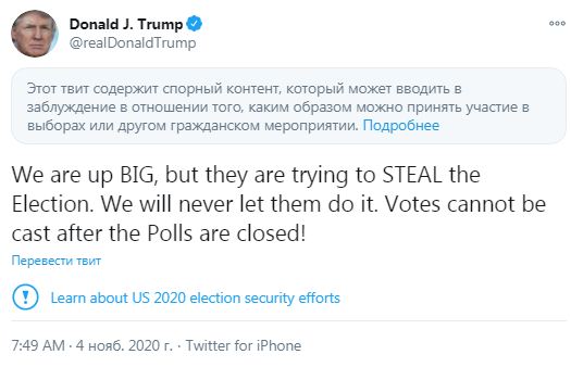 Також зазначимо, що Дональд Трамп уже заявив про свою перемогу в Твіттері. Крім того, в Твіттері він повідомив про крадіжку голосів його виборців. Модератори соцмережі негайно позначили пост Трампа як спірний.