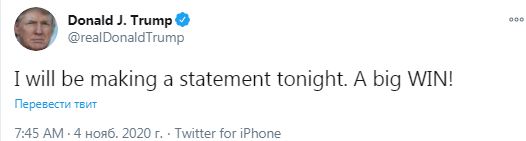 Також Дональд Трамп анонсував свій виступ перед американцями сьогодні ввечері. За його словами, він планує заявити про свою "велику" перемогу.