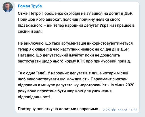 "Отже, Петро Порошенко сьогодні не з’явився на допит в ДБР. Прийшов його адвокат, пояснив причину неявки свого підзахисного – він тепер народний депутат України і працює в сесійній залі", - зазначив Труба.