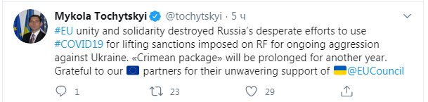 "Єдність і солідарність ЄС зруйнували відчайдушні спроби Росії використовувати COVID-19 для скасування санкцій, введених проти РФ за триваючу агресію проти України. "Кримський пакет "буде продовжений ще на рік. Вдячні нашим партнерам за їх непохитну підтримку", - написав дипломат. Ухвалене рішення для набуття чинності ще має бути затверджене Радою ЄС і опубліковано в Офіційному журналі.