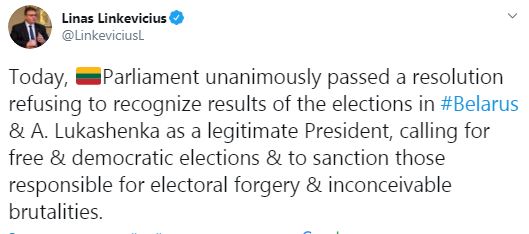 Лінкявічюс про це опублікував повідомлення в Twitter. "Сьогодні, парламент Литви одноголосно прийняв постанову про відмову визнати результати виборів у Білорусі та Олександра Лукашенка законним президентом, закликав до вільних і демократичних виборів і до покарання санкціями винних у фальсифікації результатів виборів і неймовірної жорстокості", - повідомляє Лінкявічюс.