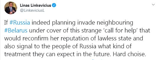 Про це міністр закордонних справ Литви Лінас Лінкявічус зробив у себе повідомлення в Тwitter. "Якщо Росія дійсно планує вторгнення в сусідню Білорусь під прикриттям цього дивного "прохання про допомогу", це підтвердить її репутацію беззаконної держави, а також просигналізує народу Росії, яке ставлення вони можуть очікувати в майбутньому. Важкий вибір", - написав Лінкявічус.