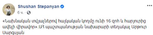 Прессекретарка Міноборони Вірменії Шушан Степанян з посиланням на заяву заступника міністра оборони невизнаної республіки Нагірний Карабах Артура Саргсяна повідомила, що жертвами конфлікту стали вже 16 осіб. Також вона повідомила про сотні поранених. "За попередніми даними, вірменська сторона має 16 жертв і понад сотню поранених", - йдеться в повідомленні.