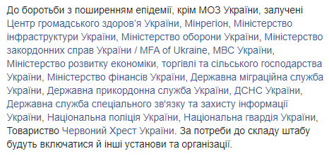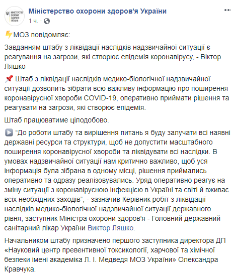 "До роботи штабу та вирішення питань я буду залучати всі наявні державні ресурси та структури, щоб не допустити масштабного поширення коронавірусної хвороби та ліквідувати всі наслідки. В умовах надзвичайної ситуації нам критично важливо, щоб уся інформація була зібрана в одному місці, рішення приймались оперативно та одразу реалізовувались", - заявив головний санітарний лікар України, заступник міністра охорони здоров'я Віктор Ляшко.