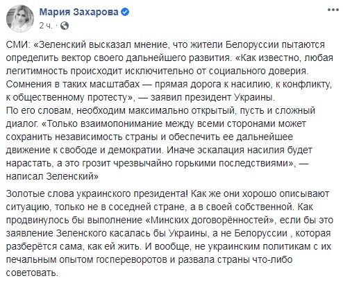 Офіційна представниця МЗС Росії Марія Захарова прокоментувала слова президента Володимира Зеленського про те, що жителі Білорусі намагаються визначити вектор свого подальшого розвитку, Білорусі необхідний максимально відкритий, нехай і складний діалог. Марія Захарова іронічно назвала слова Зеленського золотими і заявила, що ці слова добре описують ситуацію, тільки не в сусідній Білорусі, а в самій Україні. "Як просунулося б виконання "Мінських домовленостей", якби ця заява Зеленського стосувалася України, а не Білорусі, яка розбереться сама, як їй жити", написала Захарова.