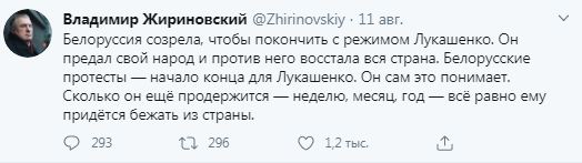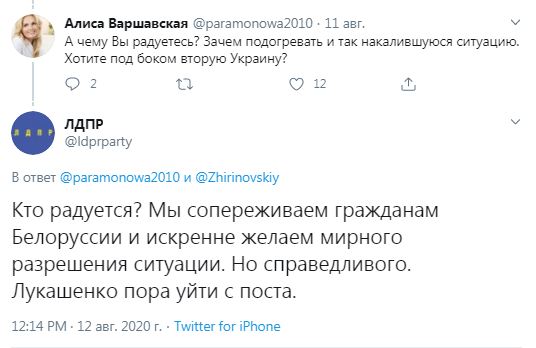 Жириновського дорікнув один з користувачів в знущанні з того, що відбувається в Білорусі. Користувач "ЛДПР" на це відповів, що вони не радіють, а співпереживають: "Хто радіє? Ми співпереживаємо громадянам Білорусії та щиро бажаємо мирного вирішення ситуації. Але справедливого. Лукашенко пора піти з поста".