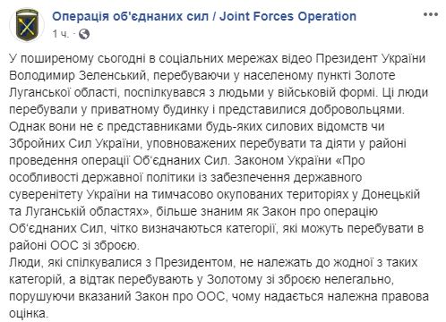 "Законом України "Про особливості державної політики щодо забезпечення державного суверенітету України на тимчасово окупованих територіях в Донецькій і Луганській областях", більш відомим, як Закон про операції Об'єднаних Сил, чітко визначаються категорії, які можуть перебувати в районі ООС зі зброєю. Люди, які спілкувалися з Президентом, не належать ні до однієї з таких категорій, а отже, знаходяться в Золотому зі зброєю нелегально, порушуючи зазначений Закон про ООС, чому надається належна правова оцінка", - повідомляється в публікації в Facebook на сторінці "Операції Об'єднаних сил".