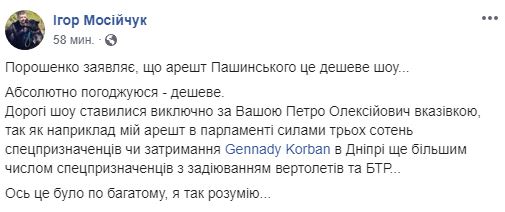 "Порошенко заявляє, що арешт Пашинського - це дешеве шоу... Абсолютно згоден - дешеве. Дорогі шоу ставилися виключно за Вашою, Петре Олексійовичу, вказівкою, так як наприклад мій арешт в парламенті силами трьох сотень спецназівців або затримання Gennady Korban в Дніпрі ще більшим числом спецназівців з допомогою вертольотів і БТР... Ось це було по-багатому, я так розумію... ", - написав нардеп на своїй сторінці у Facebook.