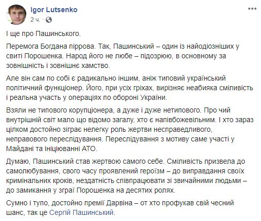"Так, Пашинський - один з найбільш одіозних в свиті Порошенка. Народ його не любить - підозрюю, в основному за зовнішність і зовнішнє хамство. Але він сам по собі є радикально іншим, ніж типовий український політичний функціонер. Його, при всіх гріхах, відрізняє неабияка сміливість і реальну участь в операціях з оборони України. Взяли не типового корупціонера, а дуже і дуже нетипового. Про чий внутрішній світ мало що відомо громадськості, хто є напівбожевільним. І хто зараз цілком гідно зіграє нелегку роль жертви несправедливого, неправового переслідування. Переслідування з мотивів саме участі в Майдані та ініціювання АТО. Думаю, Пашинський став жертвою самого себе. Сміливість привела до самозамилування, свого часу проявлений героїзм - до виправдання своїх кримінальних кроків, нездатність співпрацювати зі звичайними людьми - до замикання в зграї Порошенка на десятих ролях. Сумно і тупо, гідно премії Дарвіна - ось хто розтринькав свій чесний шанс, так це Сергій Пашинський", -написав Ігор Луценко у своєму акаунті на Facebook.