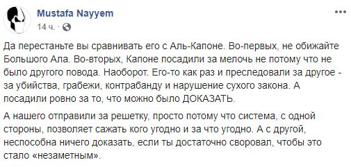 Також колишній член партії "Блоку Петра Порошенка" Мустафа Найєм провів паралель між арештом Пашинського і арештом знаменитого американського гангстера італійського походження Аль Капоне.