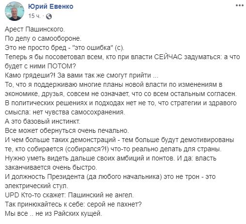 "Арешт Пашинського. У справі про самооборону. Це не просто маячня - "це помилка"(с). Тепер я б порадив всім, хто при владі ЗАРАЗ задуматися: а що буде з ними ПОТІМ? Камо грядеши?! За вами так само зможуть прийти... Те, що я підтримую багато планів нової влади щодо змін в економіці, друзі, зовсім не означає, що з усім іншим згоден. У політичних рішеннях і підходах немає не те, що стратегії і здорового глузду: немає почуття самозбереження. А це базовий інстинкт. Все може обернутися дуже печально.І чим більше таких демонстрацій - тим більше будуть демотивовані ті, хто збирається (збирався?!) щось реально робити для країни. Потрібно вміти бачити далі своїх амбіцій і понтів. І так: влада закінчується дуже швидко. І посада Президента (та будь-якого начальника) це не трон - це електричний стілець. UPD Хтось скаже: Пашинський не ангел. Так принюхайтесь до себе: сіркою не пахне? Ми всі... не з Райських кущів", -пише Юрій Євенко в соціальній мережі.