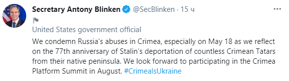 "Ми засуджуємо порушення (прав людини) Росією у Криму, особливо 18 травня, коли згадують 77-му річницю депортації Сталіним безлічі кримських татар з рідного півострова. Ми очікуємо на майбутню участь у саміті "Кримської платформи" у серпні. Крим - це Україна", - написав Блінкен.