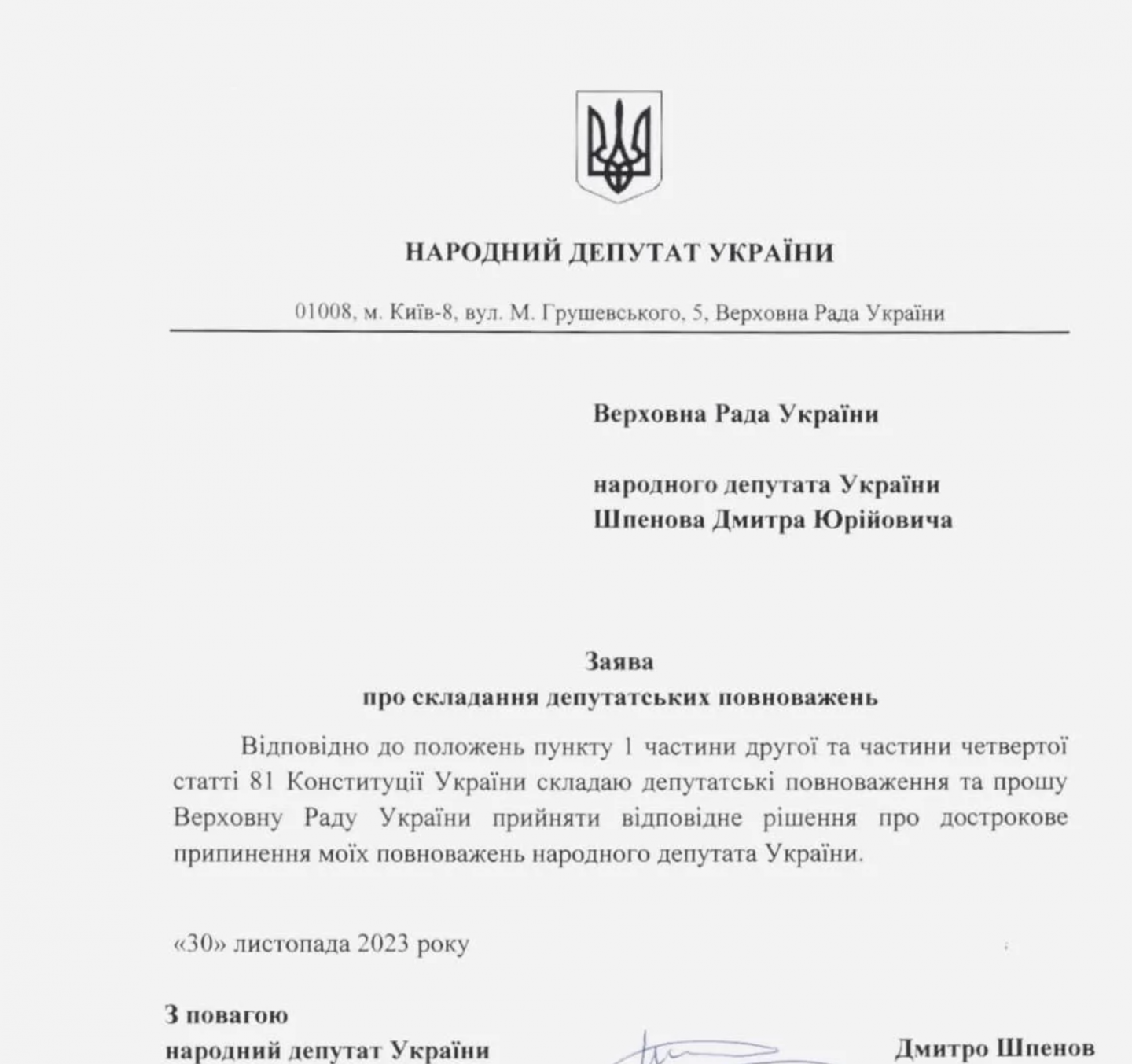 Народний депутат-мажоритарник Дмитро Шпенов подав заяву про складання депутатських повноважень. Фото документа оприлюднив іншій нардеп Ярослав Железняк у Telegram.