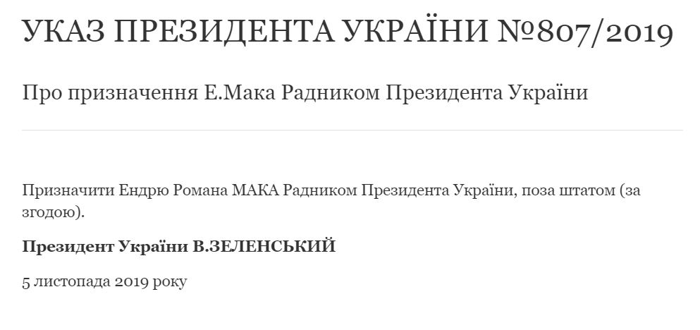 "Призначити Ендрю Романа Маку радником президента України поза штатом (за згодою)", - йдеться в указі №807/2019.
