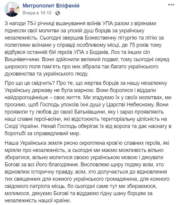 "З нагоди 75-ї річниці вшанування воїнів УПА разом з вірянами піднесли свої молитви за упокій душ борців за українську незалежність. Сьогодні звершив Божественну літургію та літію за полеглими воїнами у справді особливому місці, де 75 років тому відбувся останній бій героїв УПА з Бодаків, Лоз та інших сіл Вишнівеччини", - написав Епіфаній.
