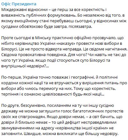 "Це не просто відверта неправда. Це свідоме нагнітання. Свідома провокаційна поведінку. Для чого? Або навіть не так: до чого тут Україна, якщо події стосуються суто Білорусі та внутрішньої недовіри?", - зазначено в реакції ОПУ, опублікованій у неділю, 16 серпня.