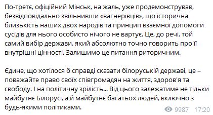 Крім того, Офіс президента з жалем констатує такий факт як передачу "вагнерівців", які вчинили злочини в Україні, борючись на боці терористів на Донбасі зі зброєю в руках, Російській Федерації. "Офіційний Мінськ, на жаль, уже продемонстрував, безвідповідально звільнивши "вагнерівців", що історична близькість наших двох народів і принцип взаємної допомоги сусідів для нього особисто нічого не варто. Це, до речі, той самий вибір держави, який абсолютно точно говорить про її внутрішні цінності. Залишимо це питання риторичним", - підкреслили в ОПУ, закликавши також владу Білорусі з повагою ставитися до прав своїх співгромадян, і не посягати на їхнє здоров'я і свободу.