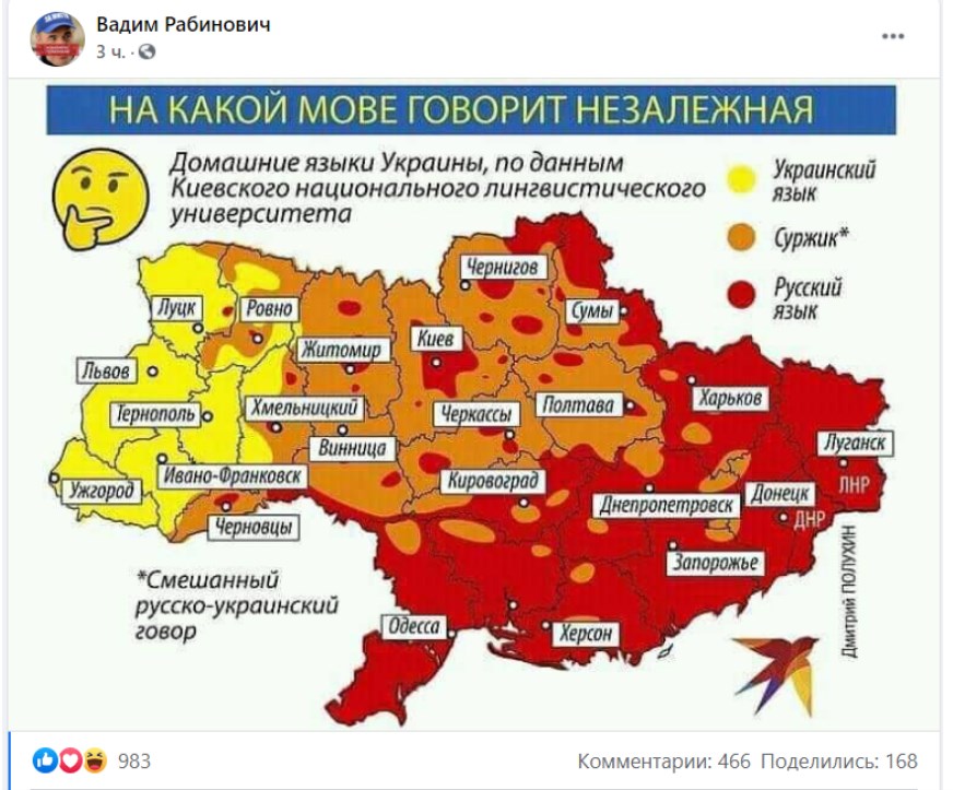 Вадим Рабінович, депутат від ОПЗЖ, опублікував мапу України з "ЛДНР" та без Криму. Політик осоромився публікацією зображення мовного питання в країні.