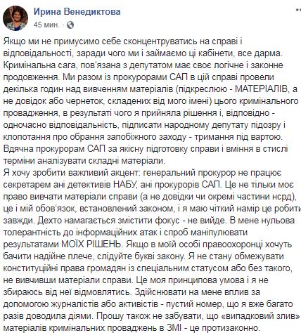 "Ми разом з прокурорами САП у цій справі провели кілька годин над вивченням матеріалів (підкреслюю - матеріалів, а не довідок або чернеток, складених від мого імені) цього кримінального провадження, в результаті чого я прийняла рішення і, відповідно - одночасно відповідальність, підписати народному депутату підозру і клопотання про обрання запобіжного заходу - тримання під вартою. Вдячна прокурорам САП за якісну підготовку справи і вміння в стислі терміни аналізувати складні матеріали", - заявила Венедіктова.